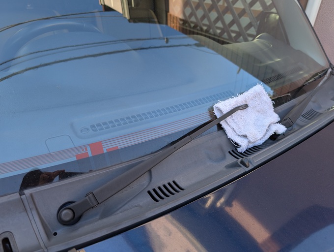 交換は一瞬で終わるのですが、ワイパーアームを立てた状態で作業すると、ちょっとした不注意でアームが戻ってしまうとガラスにキズが付くので、雑巾やウエスを挟んで寝かしておくことをオススメします。