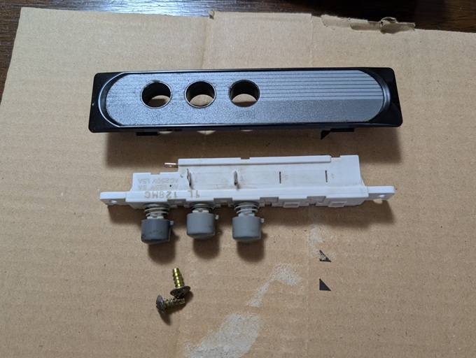 ボタンだけ入れ替えようとも考えましたが、加工が大変そうなので、現行品の4つボタン(換気扇「強」「弱」アリ)タイプに交換することにしました。