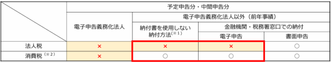(※2)前課税期間の確定分消費税が48万円超える場合に発生する消費税の中間申告については、中間申告書兼納付書を、e-Tax義務化法人の皆様を除き、対象者へ引き続き送付しています。これにより、消費税の中間申告書兼納付書は届く一方で、法⼈税の予定申告分納付書は届かない場合がございますので、特に法⼈税予定申告分の納付忘れにご注意ください。