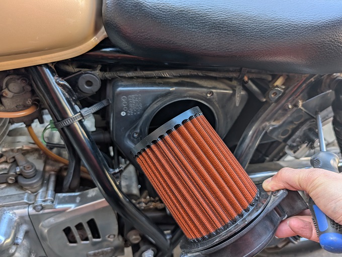 そこで、取り敢えずの横着作業として、キャブレターを車体から外さずに、エアクリ側から直接キャブクリーナーを吹き付けてみることにします。