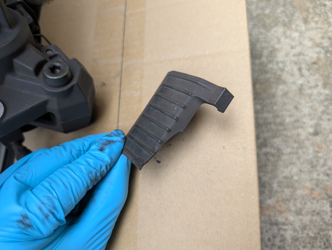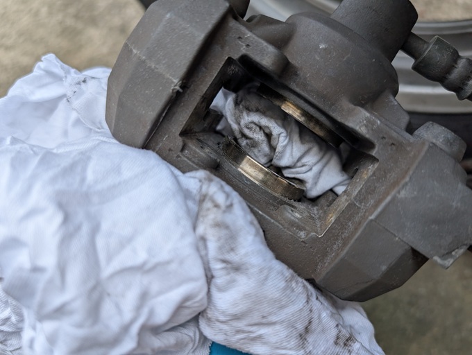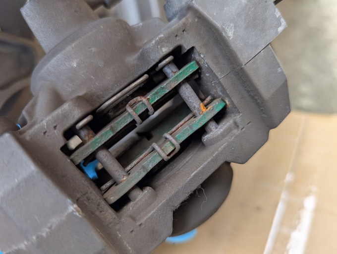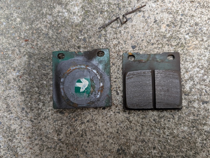 汚れで黒く見えていた既存のブレーキパッドが、緑色だったことに少し驚きました。