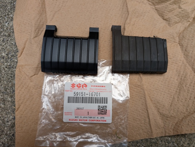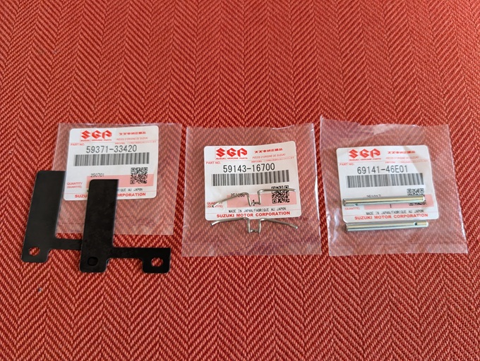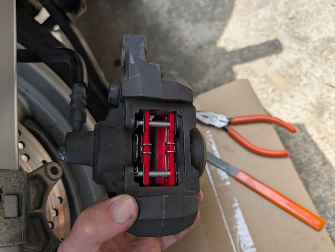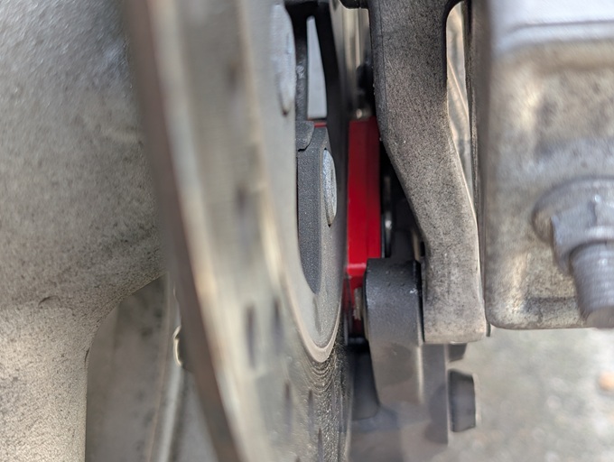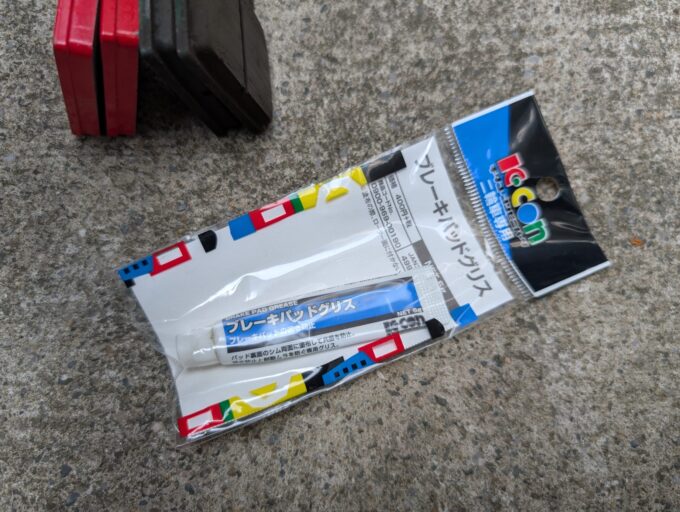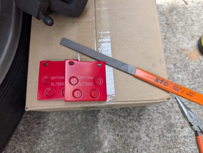 ブレーキパッドも、残量はあるものの、メーカー不明で古そうだったので、デイトナ「赤パッド」に交換します。