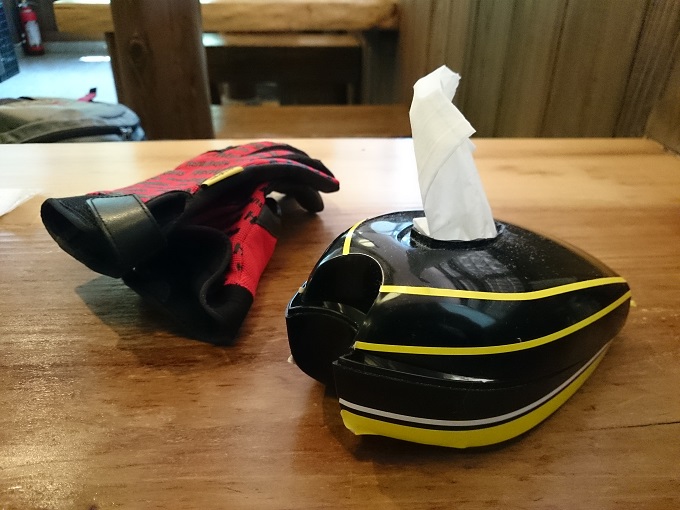 店内では、早速「バイク弁当」の弁当箱を加工したティッシュケースがお出迎え。