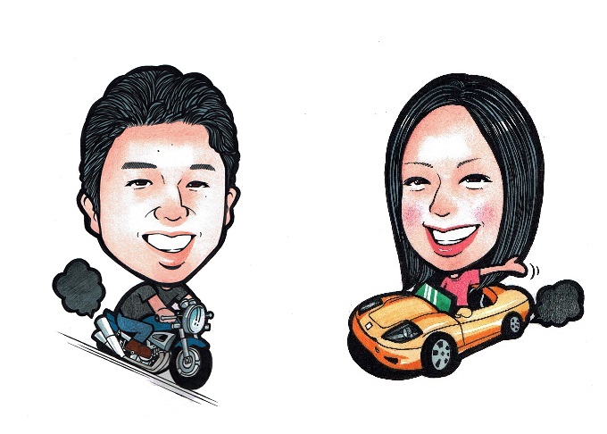 最近では、結婚式(披露宴)で使用するウェルカムボードに新郎新婦の似顔絵を採用する方が多く、「クルマ好きカップル」や「バイク好きカップル」の結婚式では、愛車と新郎新婦が一緒に描かれているウェルカムボードも目にしますよね。