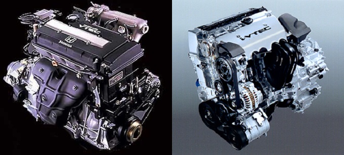 右側:2000年に発表された、VTC(Variable Timing Control、連続可変バルブタイミングコントロール機構)を加えた進化型i-VTECエンジン