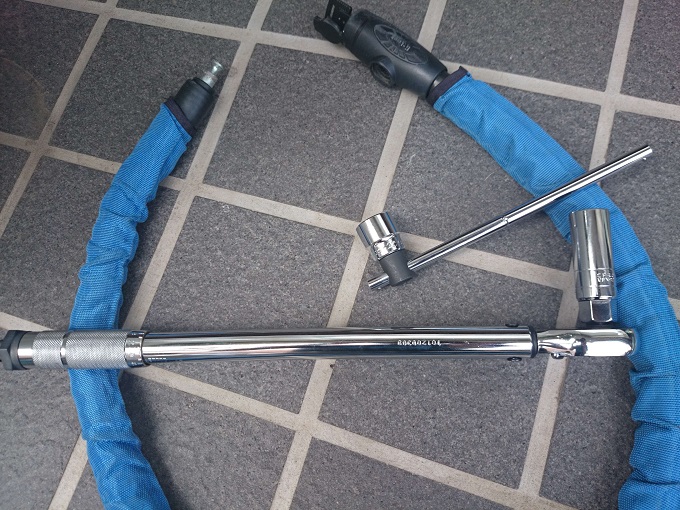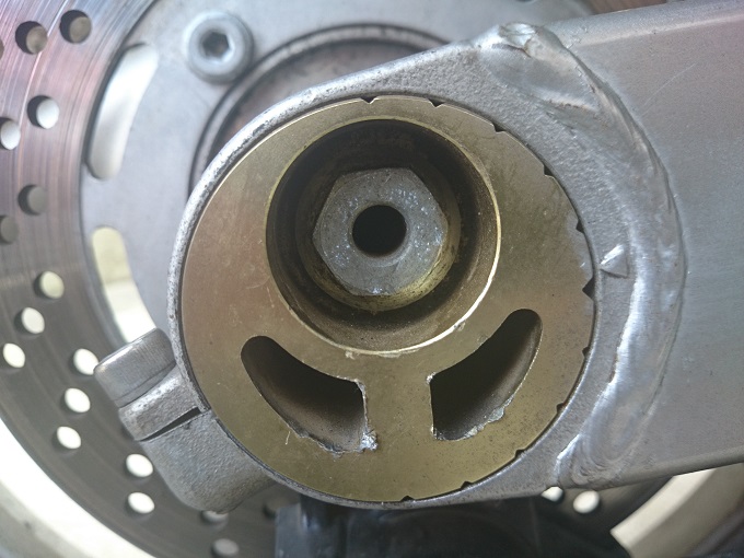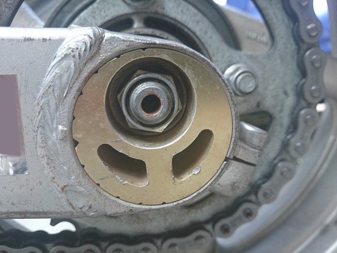 車載工具のアジャスタレンチが曲がってしまっていることと、チェーンアジャスタ(エキセントリックカラー)にキズがあることが若干気がかりではありますが、手持ちのMY工具(FPC)で対応可能な様です。ちなみに、チェーンアジャスタ(エキセントリックカラー)は、特殊工具(車載工具)を使わずに、ラジオペンチ+モンキーレンチなどの組み合わせで無理やり回す方法がある様で、キズはその際に付いたものだと思われます。