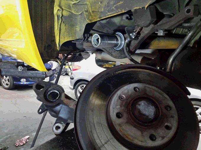 こちらは、乗っていて症状を感じることはなかったのですが、右リアのトレーリングアームとクロスメンバーの接続部分にガタがあるとのご指摘を頂きましたので、この部分のベアリングを左右とも交換しました。