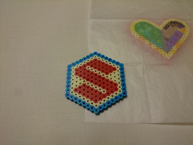 アイロンビーズというのは、高温で溶けるパイプ状にカットされたビーズのことで、このビーズを専用のボードの上に並べて、アイロンをかけるとビーズ同士が熱融着してモチーフが完成するという仕組みだそうで、実際にやってみると、大人も夢中になれるくらい楽しい知恵玩具でした。