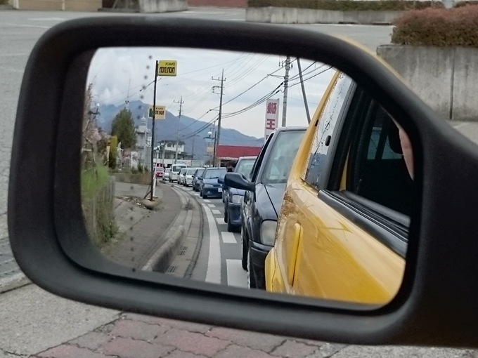 写真:編隊走行(前から3台目のサイドミラーに映る景色)