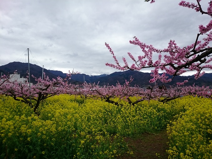 写真:御坂農園さんのガーデンハウスから見える桃の花と菜の花