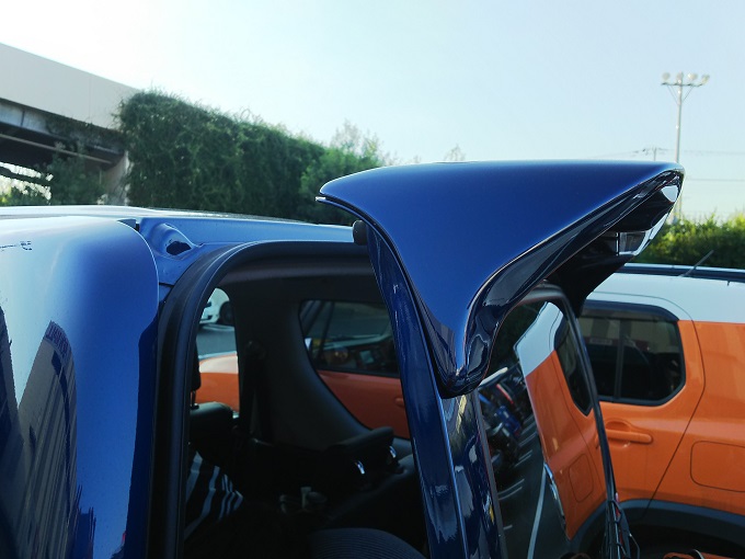 でも実は、リアゲートが横開きということもあり、「スズキ純正部品」のデザインではルーフエンドスポイラーの横幅がボディ側面よりかなり短くなってしまうのです…。