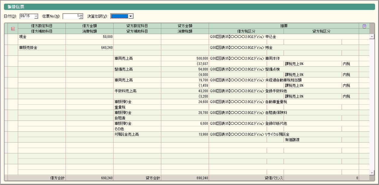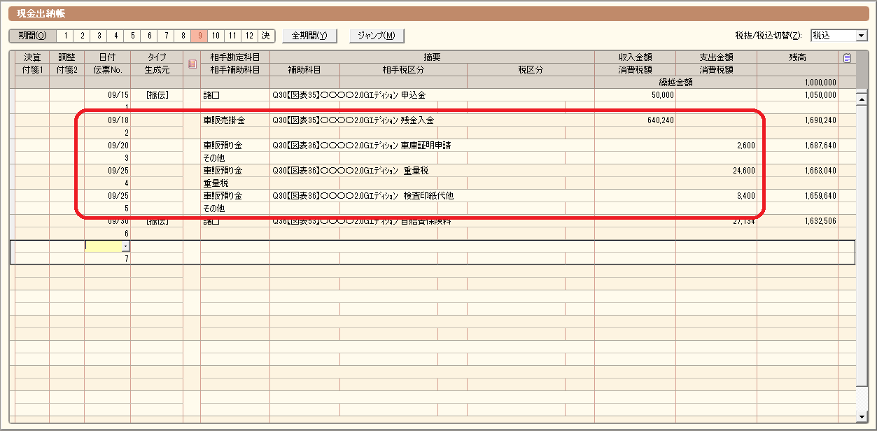 ナンバー付車両の販売なので、「自動車税相当額」の論点があり、自賠責保険は新規加入なので「自賠責の手数料売上の計上方法」もご確認頂ける事例なので、我ながらグッドチョイス!だと思います(笑)