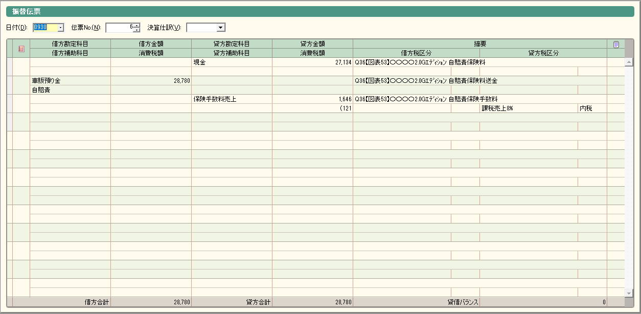 ここまでの段階で、お客様から預った自賠責保険料は保険会社に未送金となっているので、『車販預り金_自賠責』の科目残高が28,780円残っています。