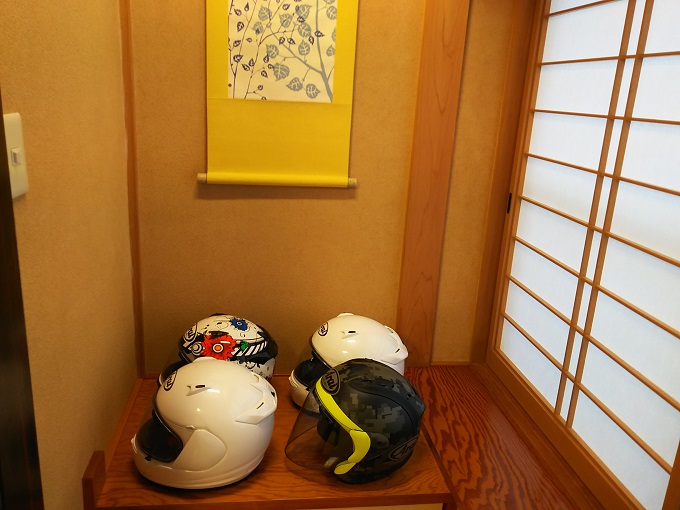 一時的とはいえ、4台のバイクが自宅兼事務所に集結したことに伴い、ヘルメットも4個集まりました。