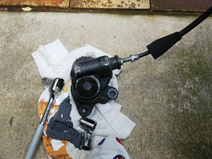 まず、メインのボルト2本を緩めて、ワイヤーが繋がったままのピストン側を外します。