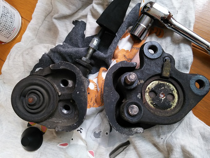 本来はキャリパー側のブレーキワイヤーを外して作業したかったのですが、こちら側は構造が全く分からず、バラしてみて元に戻せなかったら悲惨なので、今回はレバー側のタイコから外してワイヤーを繋げた状態で作業することにしました。