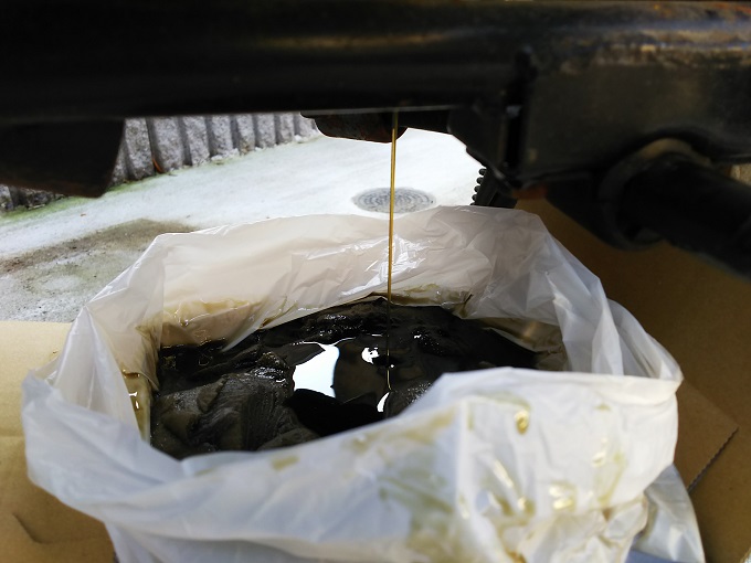 オイル交換作業は、ただオイルを抜いて入れるだけなので一瞬で終わるのですが、出てきたオイルは、予想以上にキレイでした。