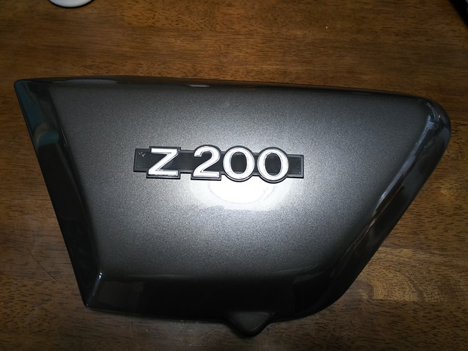 先日、バイク達を虫干ししていたところ、Z200のサイドカバーの「Z200」エンブレムが外れていることに気付きました。