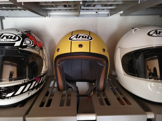 我家には、私用と相方用のバイク用ヘルメットが計5個(全てArai)あるのですが、夏場は専ら「CLASSIC MOD」シリーズの「スターズ・キャメル」というスモールジェットを使用していました。