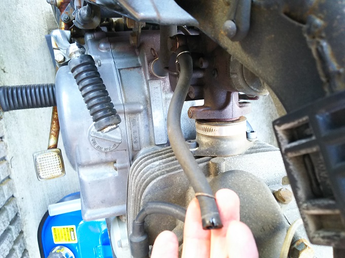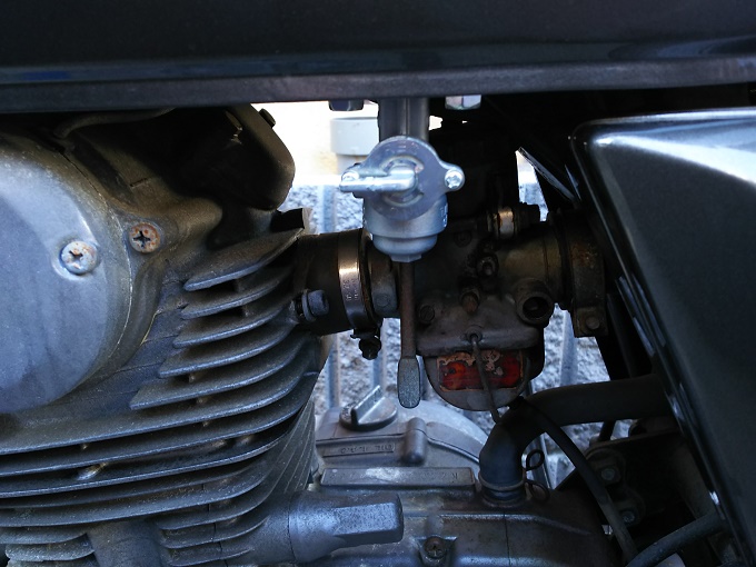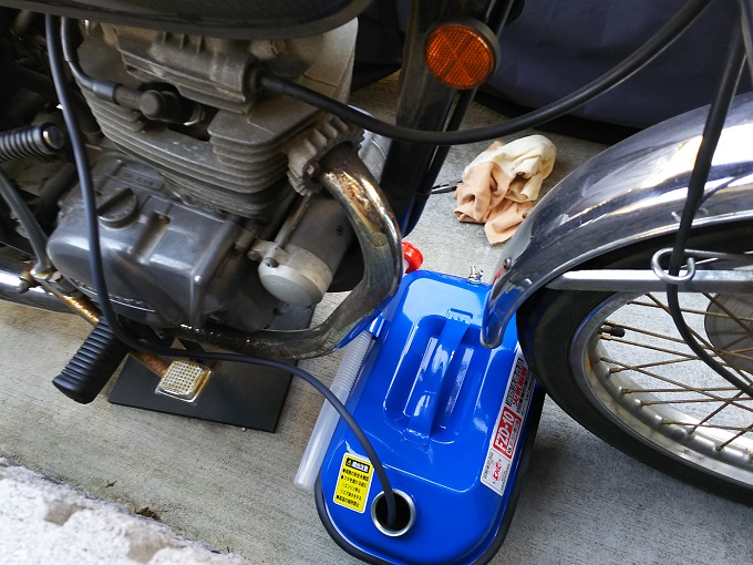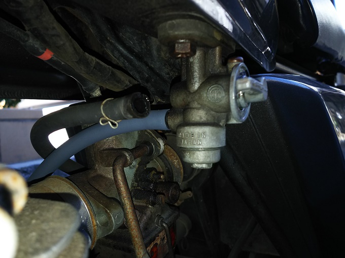まずはタンク内のガソリンを抜く必要があるのですが、上からシュポシュポ(正式名称は分かりません)で抜くのも面倒なので、コックからキャブレターにガソリンを供給する部分に長めのガソリンホースをドレンとして繋いで、下から抜くことにしました。