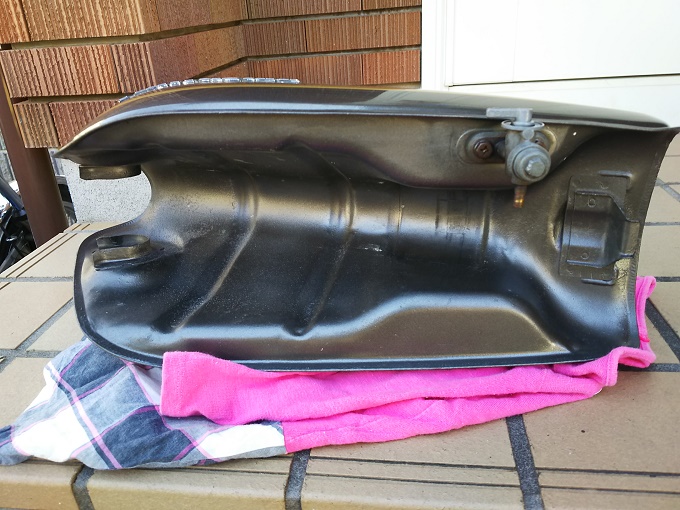 さて、下したタンクはと申しますと、まだ若干ガソリンが内部に残っているので、コック側を上にして横置きにします。