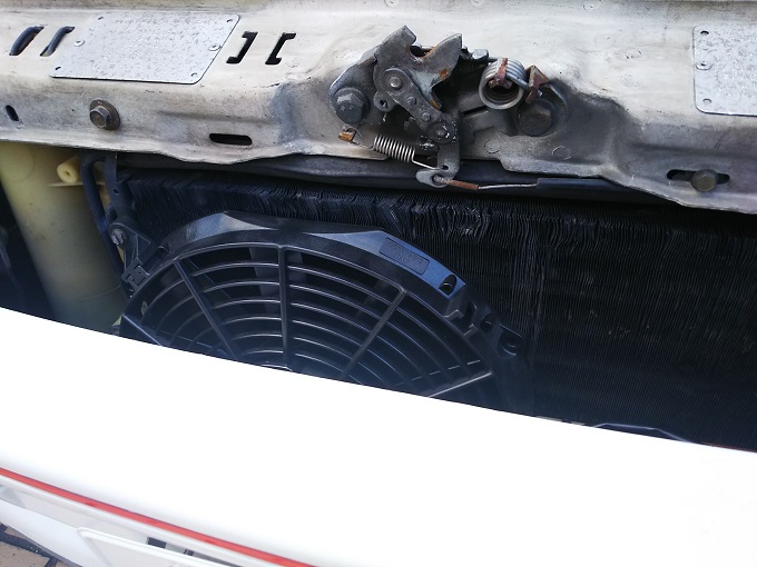 これはエアコンコンデンサ用の冷却ファン(後付け)なのですが、奥側のラジエター用の冷却ファン(純正)と共回りするように配線されています。