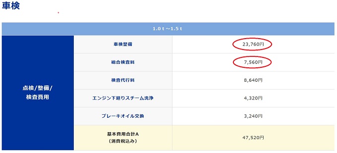 こちらの画像は、スズキ自販東京さんのHPに掲載されている車検基本費用(普通車1t~1.5t)ですが、このうち赤丸で囲った「車検整備」と「総合検査料」の合計31,320円(消費税8%込み)が無料になります。