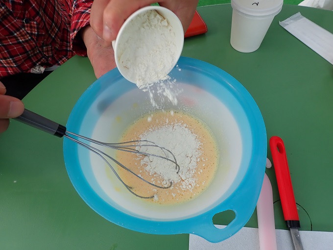 砂糖が溶けたら、強力粉(紙コップ1杯分くらい?)を少しづつ加えながら混ぜて、生地を完成させます。