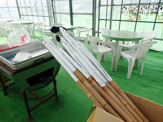 生地ができたら、竹の棒にアルミホイルを巻いた武器が登場します!