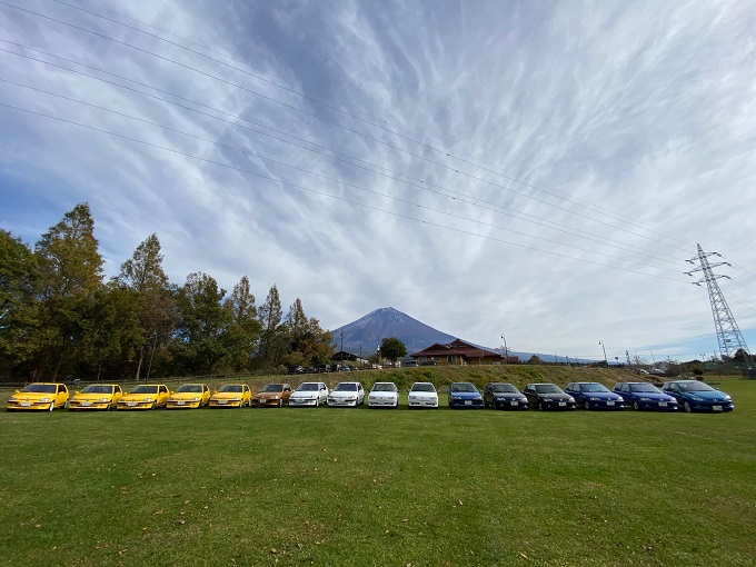 富士ミルクランドでは、いつも通り富士山をバックにクルマを並べて写真撮影を行いました。