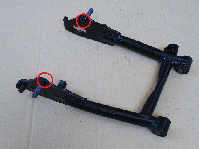 リア回りをバラしてみないと何とも分かりませんが、おそらく赤丸で囲った部分の純正スイングアームに溶接(*)されているリアサス取付用のボルトのが外れたのだと思います。