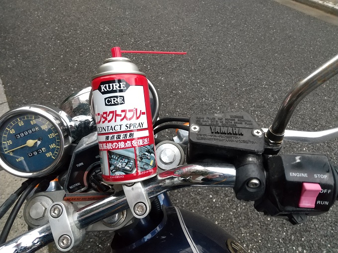 それから、旧車だからか、ヤマハ車だからか、その両方か、各所の接触が渋くなってきているので、各所にコンタクトスプレー(接点復活剤)を入れておきます。