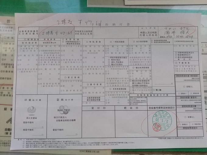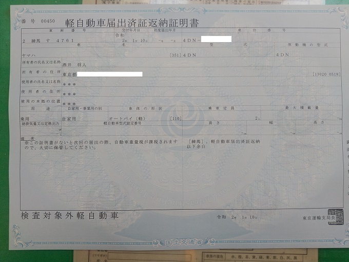 なお、2019年7月1日から、新規登録(中古車)をする際に「譲渡証明書」が必要になったようなので、今回発行された「軽自動車届出済証返納証明書」と「自賠責保険証明書」と「譲渡証明書」を次のオーナーさんにお送りしました。