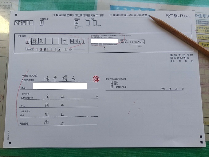1つは、「申請書(軽二輪第5号様式)」で、ナンバー返納後に再び受付に提出するので、必要事項を記載しておきます。