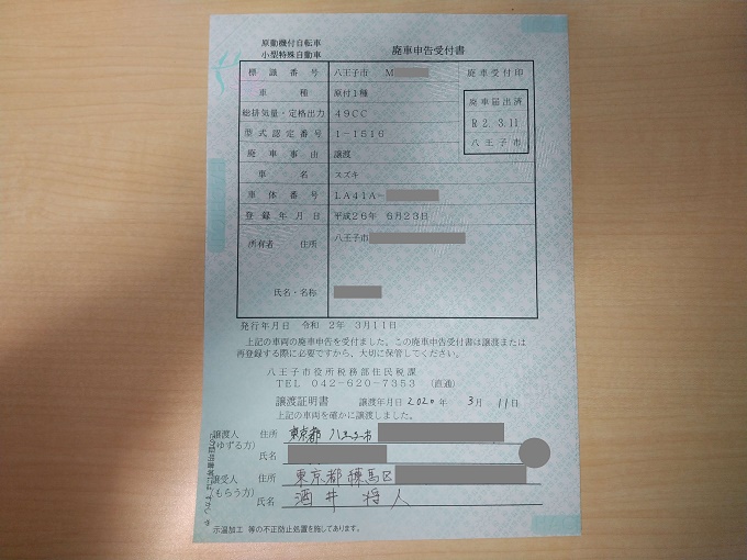 無事にナンバープレートと「原動機付自転車標識交付証明書」が交付されました。