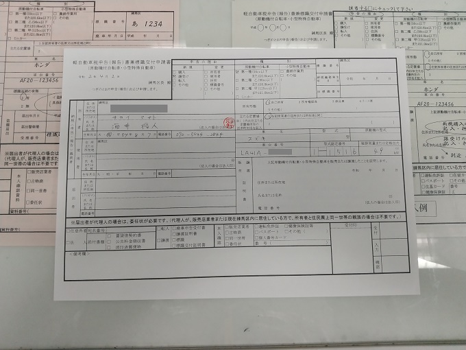 現地にて「軽自動車税申告書兼標識交付申請書」に必要事項を記入して、