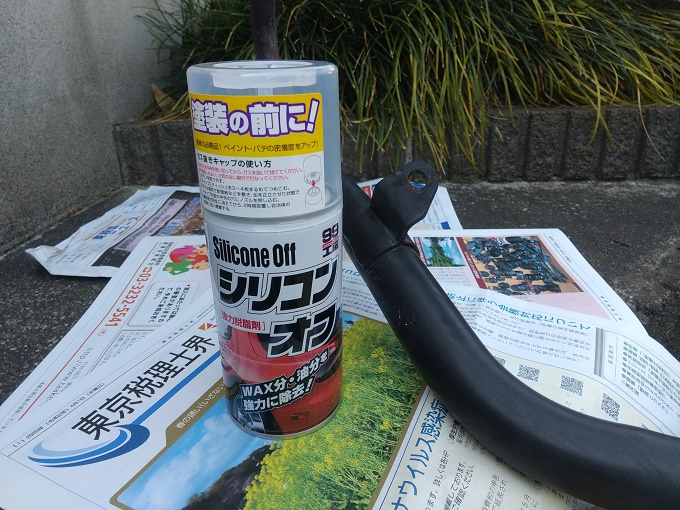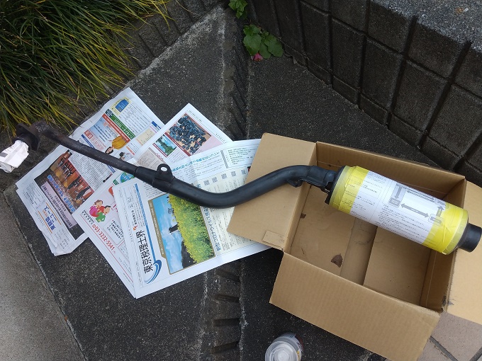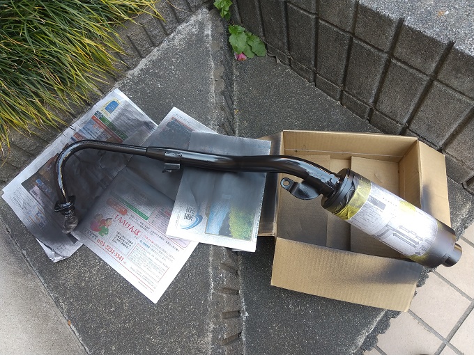 この耐熱塗料は、実際に装着して熱を入れてはじめて硬化するタイプなので、マフラー交換の作業をするまでは、ベランダの物干しにでも干しておくことにします。