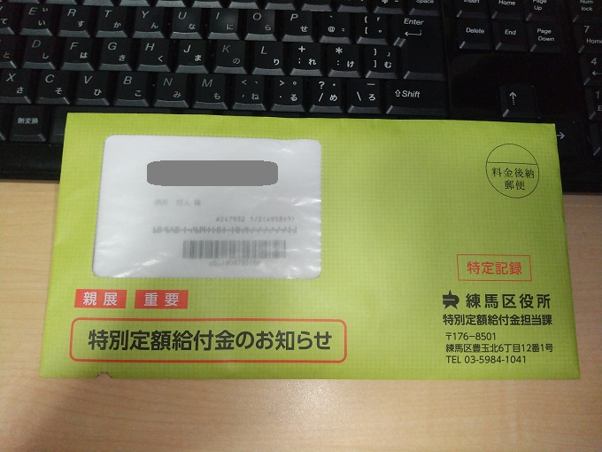 写真:本日練馬区から届いた「特別定額給付金のお知らせ」