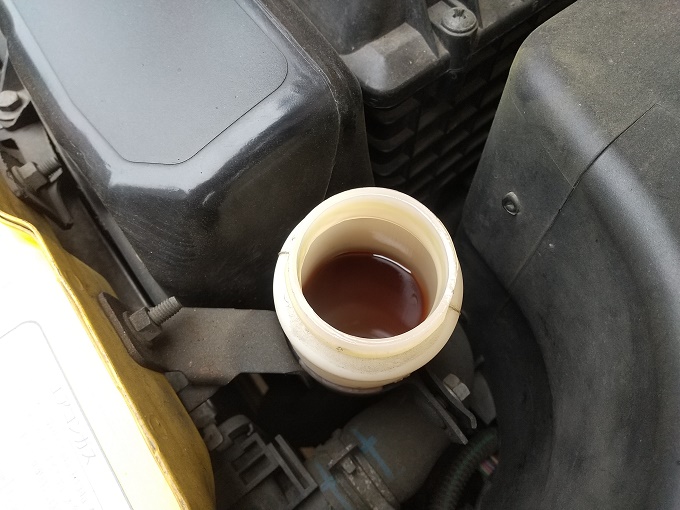 下記写真の添加剤を注入してすぐの状態と比べると、ずいぶんとパワステフルードが循環したと思います。