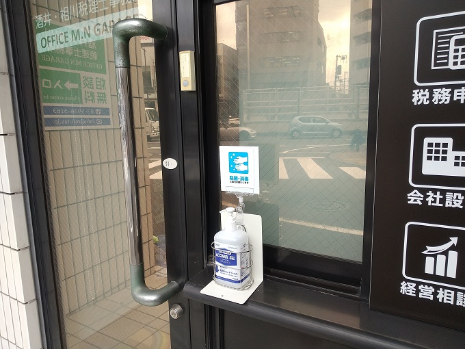 写真:事務所入り口にはアルコール消毒ジェルを設置
