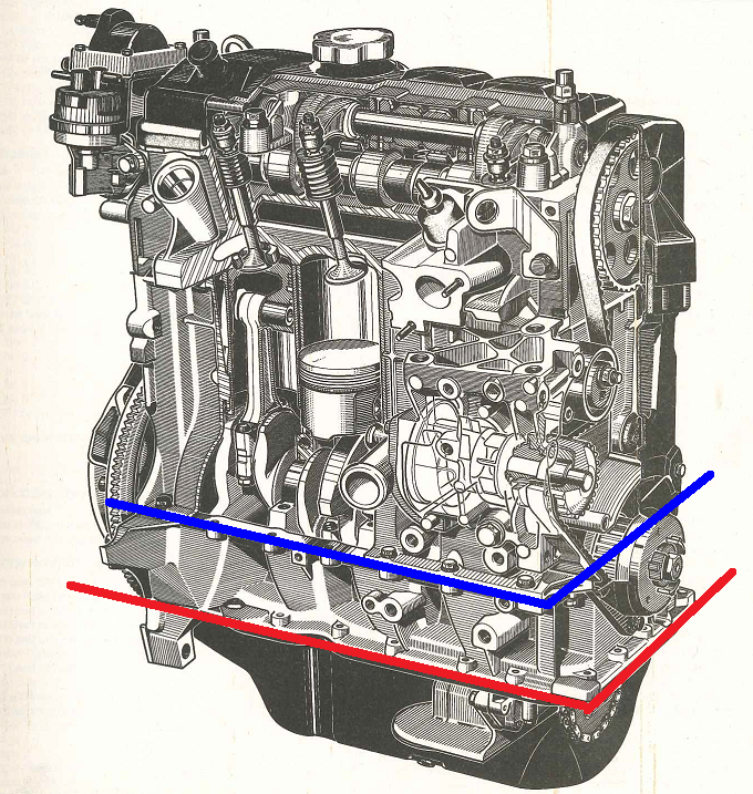 上記の図解は、エンジンを後方から見たものなので少し分かり辛いですが、赤線のオイルパンの継ぎ目と、その1ブロック上の青線のところの両方からオイルが漏れているそうです。