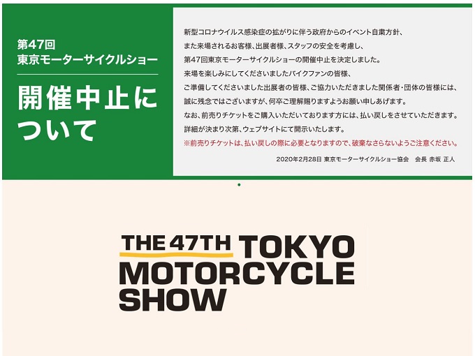 第47回東京モーターサイクルショー2020 開催中止(新型コロナウイルスの影響が続々と)