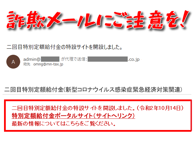 詐欺メール注意!2回目特別定額給付金の特設サイトは偽物です!