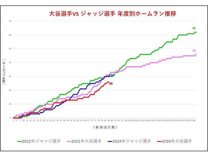 大谷選手とジャッジ選手の2024年ホームランペースをグラフ化して比較(過去最多年度との比較)