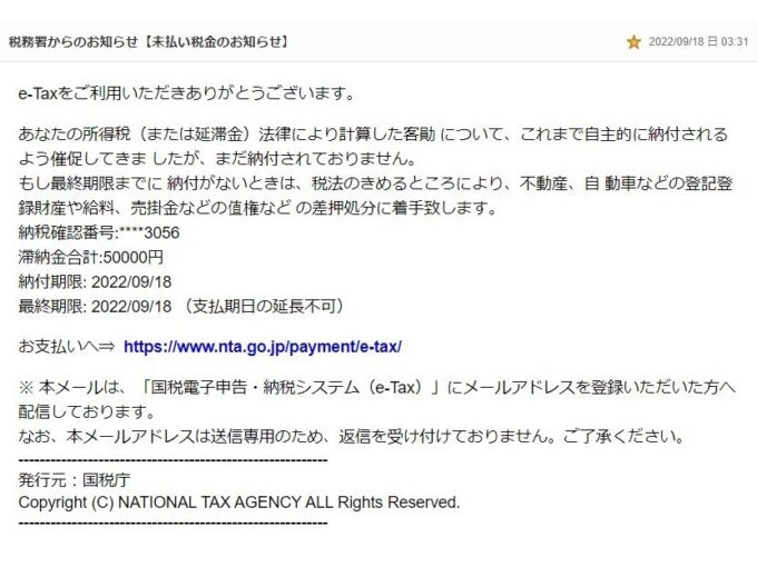 要注意「差出人:e-Tax」「https://www.nta.go.jp/payment/e-tax/」は詐欺サイトへの誘導です!