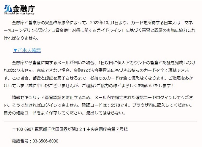 詐欺メール注意!国税庁の次は金融庁…。From「no_reply@mail.fsa.go.jp」