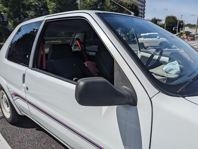 プジョー106 Rallye(テンサンラリー)右側ミラーの視界改善!黒樹脂復活剤で黒艶も…?